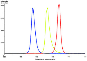 Typically, an RGB LED is driven such that the brightness of each color can be controlled independently. Combining different brightness levels can produce “million of colors”, with the exact number depending on factors that are described in Part 4: LED Control Methods. Unfortunately, due to the relatively narrow spectrum of light frequencies emitted by the individual red, green and blue LEDs, RGB LED devices are not able to produce a pure white color that is comparable to the broad-spectrum light produced by typical incandescent or LED “light bulbs”.