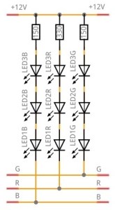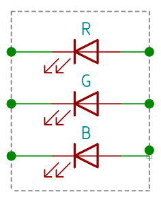 One of the most common packages for RGB LEDs is often referred to as a 5050 SMD (surface mount device) package. This is actually a plastic leaded chip carrier (PLCC) with dimensions 5.0mm x 5.0mm x 1.5mm and a clear epoxy lens exposing the three LED die mounted inside. In the simplest case, the package contains three LEDs with the anode and cathode of each LED brought out to pins on the 6-leaded package. These devices are typically rated for a maximum continuous forward current If of 20mA per LED. The maximum per-LED power is the product of If and the corresponding forward voltage drop Vf. Since the voltage drop depends on the detailed chemistry and physics of each LED, the formula for total device power dissipation is P = If x (Vf.red + Vf.green + Vf.blue). Since Vf varies by up to +/-20% based on the actual forward current, a nominal Vf value is specified at the rated value of If. For low-power LEDs the nominal Vf.red = 2.0V and Vf.green = Vf.blue = 3.2V. So P = 0.02A x (2.0 + 3.2 + 3.2) = 0.17W. That’s actually a pretty small amount of power given how bright these LEDs are, so thermal management isn’t too much of a concern unless they are used in high-density configurations such as LED strips, possibly coated with weatherproofing material that impairs convection cooling. For maximum performance and longevity it’s advisable to mount LED strips to aluminums channels or other metal substrate that will help dissipate heat.