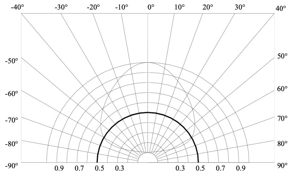 Beam Angle: All of the LEDs described in this article are designed to throw light in the same general direction; that is, all of the emitted light beams will travel in a direction that is less than 90 degrees from the axis perpendicular to the face of the device. The light is most intense along this central axis and falls off as the angle of a beam approaches 90º, as illustrated in the typical plot below (the effect is 3-dimensional although the plot is only 2-D). The beam half-angle (⍬½) of an LED is specified as the angle at which the light intensity drops to one-half of the level at 0º. So in the plot below ⍬½ = 60º.