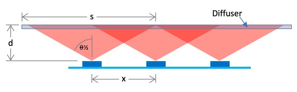 - To achieve 50% beam overlap: For a given LED strip with spacing x, mount the diffuser at distance d such that the beam spread s is twice the LED spacing (x). That is, s = 2 • x.