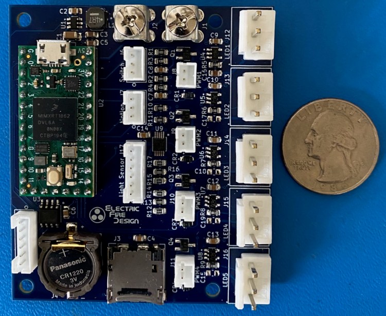 While I was crying over those setbacks, I discovered that availability of the Richtek driver chip had completely dried up. So…I switched to yet another chip, the Texas Instruments LM3405. This one requires a few more external components, but allows me to use a much smaller inductor. Also, it has an excellent data sheet/application notes, so I was more confident that it would work. And it did! Here’s version 2 of the PCB, with the Teensy 4.0 MCU mounted on the back side.