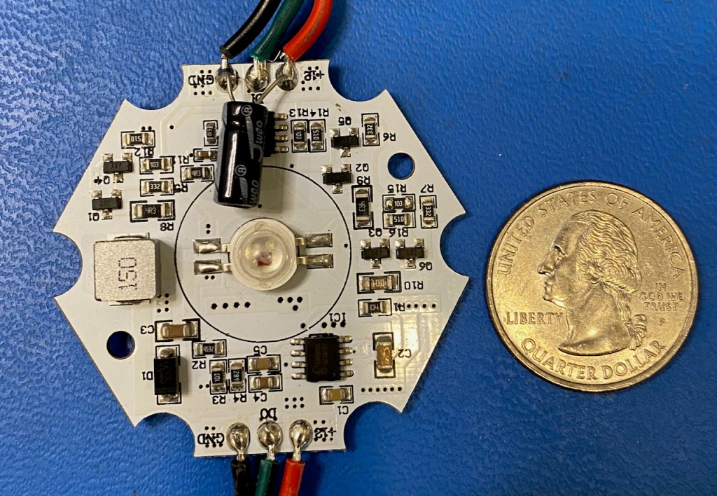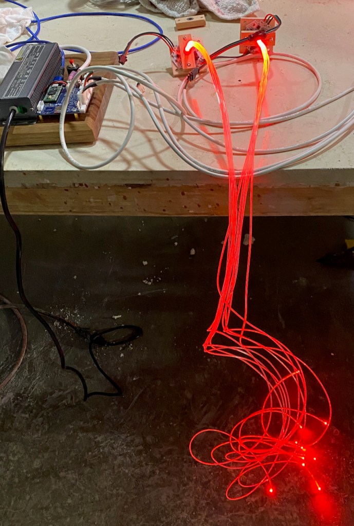 This fiber-illumination approach works pretty well, especially if the fibers ends are cleanly cut and polished. Unfortunately, the LED modules are pretty unreliable, and three of the five that I purchased have failed. I won’t be buying these again, and in the future will instead use a variation of my FidoLight 10W RGBW spotlight as a fiber illuminator.