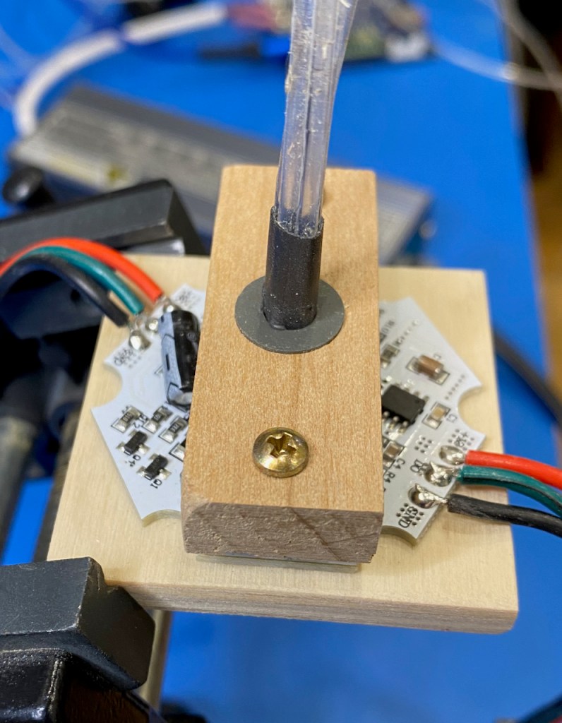 The fourth LED output is used to drive two high-intensity 3W RGB addressable LED modules that I bought a long time ago from AliExpress. These are used as illuminators for side-emitting fiber optic strands that will be wrapped around Pele’s copper wire “hair”. I mounted these to small plywood squares and MacGyver‘ed a bracket to hold a bundle of five fibers directly over each LED.