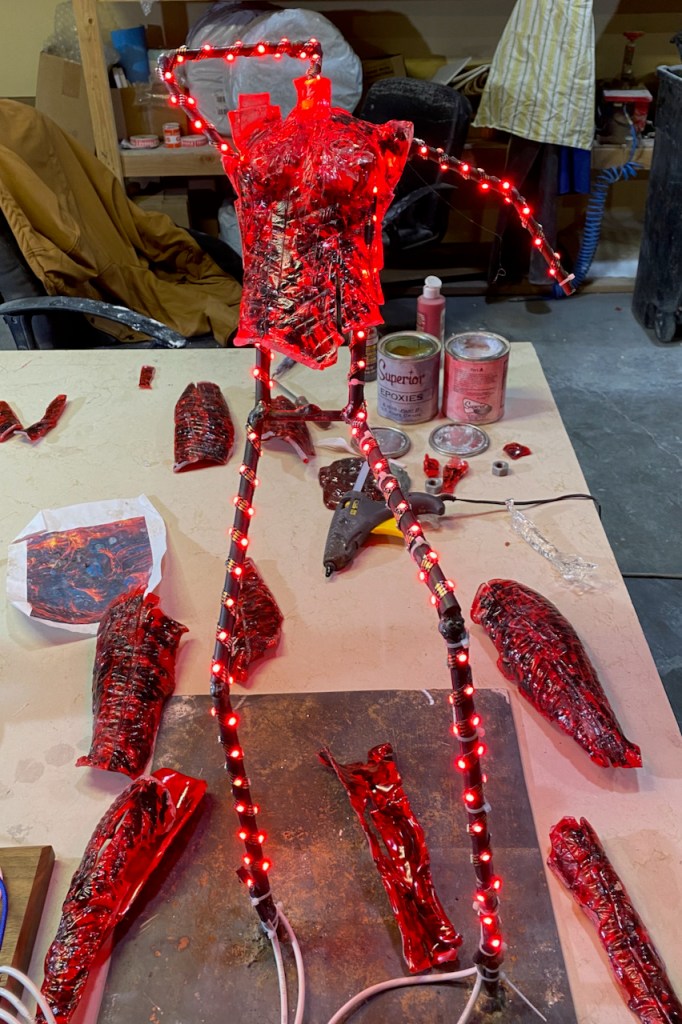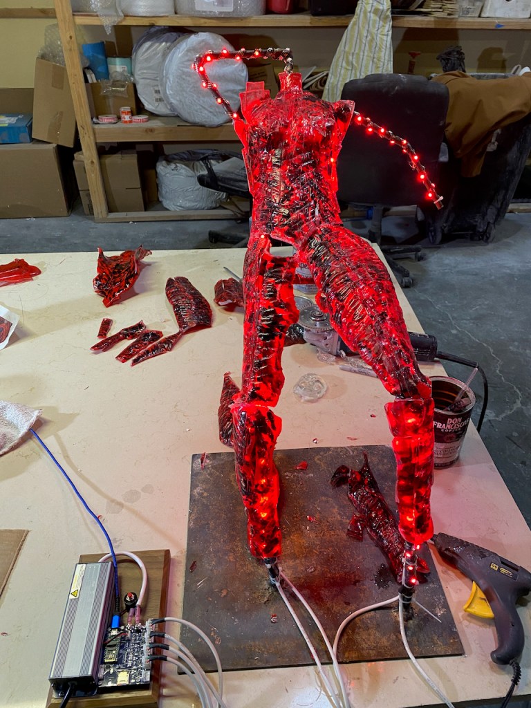 Since the glass used to form Pele’s body is painted translucent red and black on the backside, and because the red paint pretty effectively filters out other colors, the options for the LED light colors are pretty limited. I ended up using using pure red everywhere but the head, which is yellow-orange.