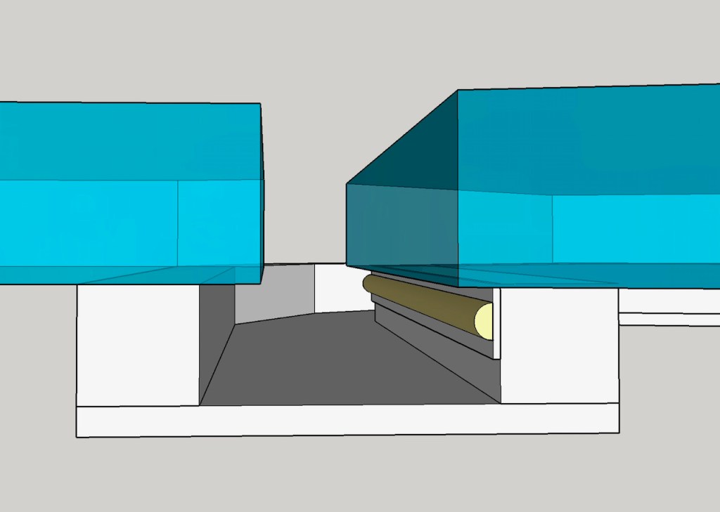 Although the backlit glass will look cool, Peter really wanted emphasize (i.e. to light up) the visible portions of the exoskeleton. That was a tough challenge, with the constraint that the external lighting components should be largely hidden from direct view. After discarding several approaches, we settled on the idea of using white LED strips mounted to the sides of “standoff” walls that provide the mounting surface for the glass plates, so that the plates appear to hover above the exoskeleton.
