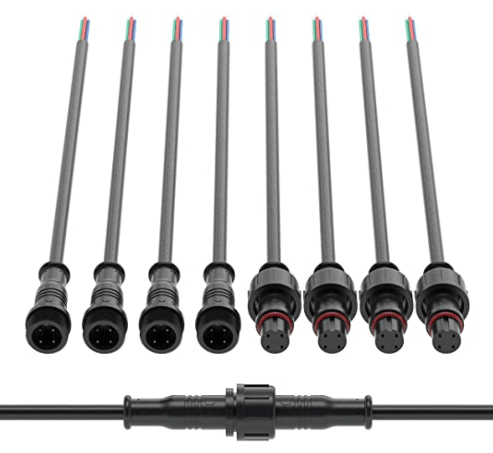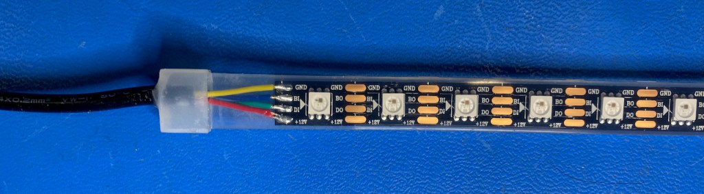 The quality of the strips I received is excellent. The silicone sleeve is chemically bonded to the conformal coating, giving them very good optical clarity compared to the IP67 strips with a non-bonded sleeve. They are slightly less flexible, but that’s fine for this application. Each strip comes with a small 4-pin waterproof connector on each end. I don’t yet know how reliable these connectors will be (a bit nervous about that), and the gauge of the pigtail wire is only 24 AWG, a little wimpy in my opinion. The short pigtail section gets warm when running a strip at full brightness.
