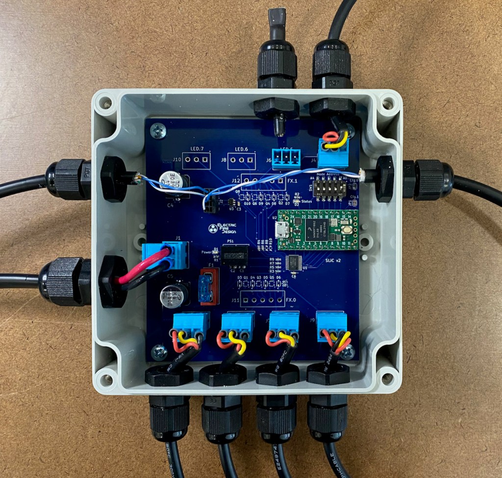 The genesis of the SLiC board was something that I called the Distributed Lighting Controller (DLC), which was intended to be very small and capable of driving two RGBW flood light fixtures. Power to each DLC would be distributed over the same Cat5 cable as the SLiCBus serial data signals. Maybe I’ll return to developing that concept at some point, but the DLC had too many limitations to be used for the Manta or other near-term projects. So the “new and improved” SLiC board has a power input that’s separate from the (now) 2-wire SLiCBus and uses the same pluggable screw terminal connectors as the FLiCr board. The boards can be assembled to support up to eight addressable LED strip outputs or two RGBW fixture outputs, each with a dedicated connector.