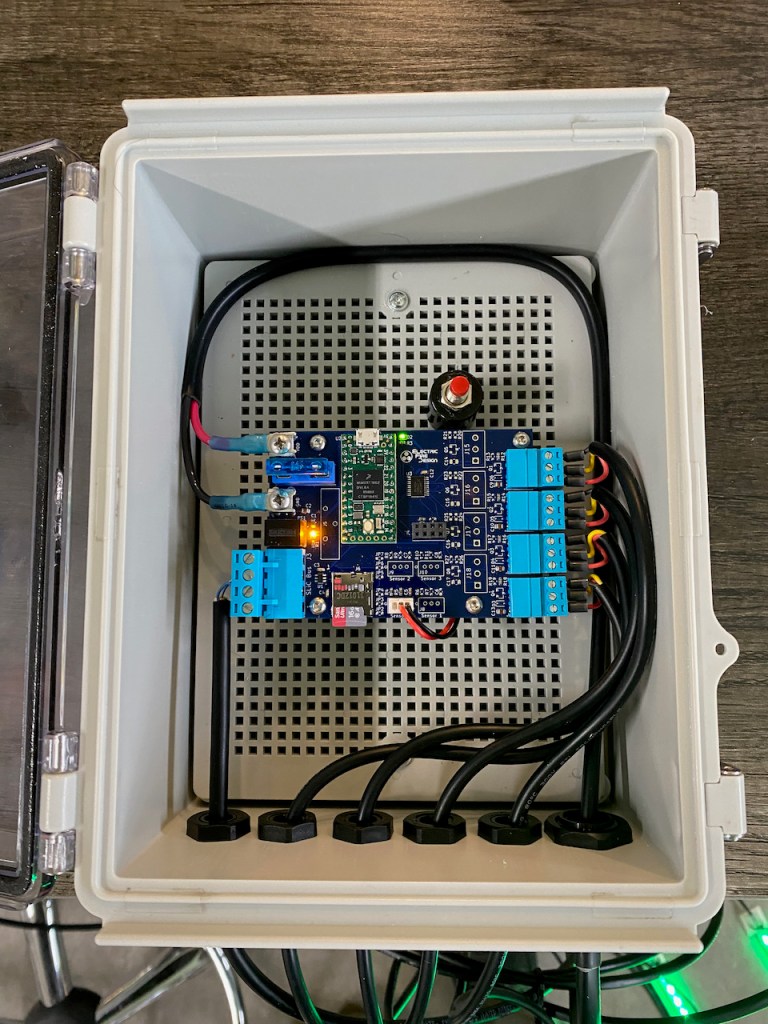 The additional connectors resulted in a larger board, with the side benefit that assembly into a waterproof enclosure with cable glands is much easier than the DLC. The dimensions of the enclosure are 4.803″ L x 4.724″ W (122.00mm x 120.00mm) X 2.165″ (55.00mm). While the enclosure I selected is more expensive (about $20 USD) than those available on Amazon, it’s much higher quality and very easy to use.