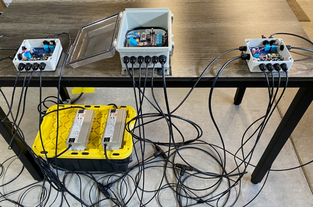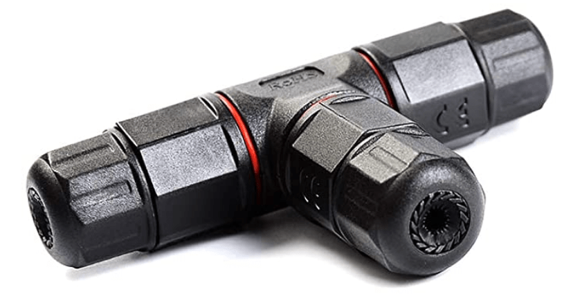 For the power connections I used 14 AWG stranded 2-conductor cable that has high resistance to moisture and UV radiation. For the “tee” connections I used these waterproof junction “boxes” that are rated for 25A.
