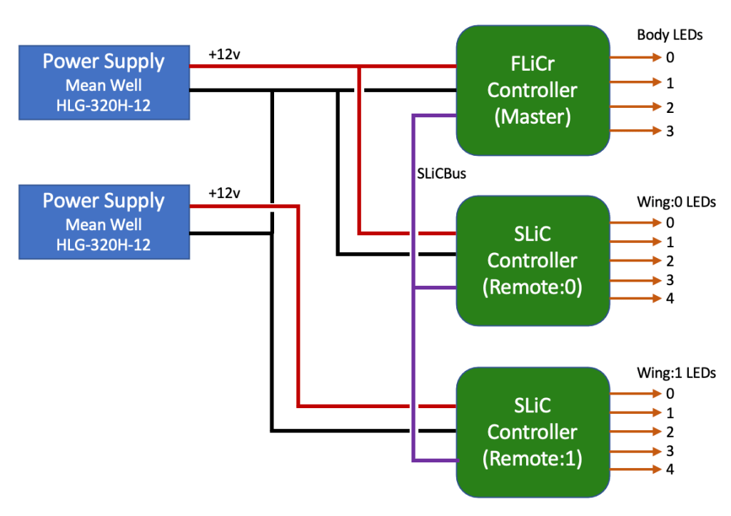 WS2815 LED strips require 12-15mA per pixel at maximum brightness (regardless of color), so 2000 pixels requires a maximum of 30A at 12v, or 360 Watts. My preferred power supply vendor is Mean Well, so I decided to use two HLG-320H-12 units. These are rated for 22A (264W) of continuous current at ambient temperatures up to 50°C (122°F), with an expected lifetime of 100,000 hours (11.4 years). One power supply will drive only the 5 strips in one of the Manta’s wings and its associated SLiC controller, requiring about 9.5A. The other power supply will drive the second wing and its SLiC controller, plus the master FLiCr controller and the 4 LED strips in the Manta’s central body. Its maximum load will be about 20.5A. Normally I prefer to run a power supply at no more than 85% of its rated limit, but in this situation I think it will be OK: