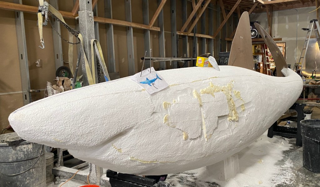 First, there’s the 20-foot long glass and steel Mako shark that artist Peter Hazel plans to display at Burning Man in late August. I described the basics of the shark’s construction and the lighting approach in this previous post. Peter has now finished sculpting the shark’s body from a huge block of styrofoam.
