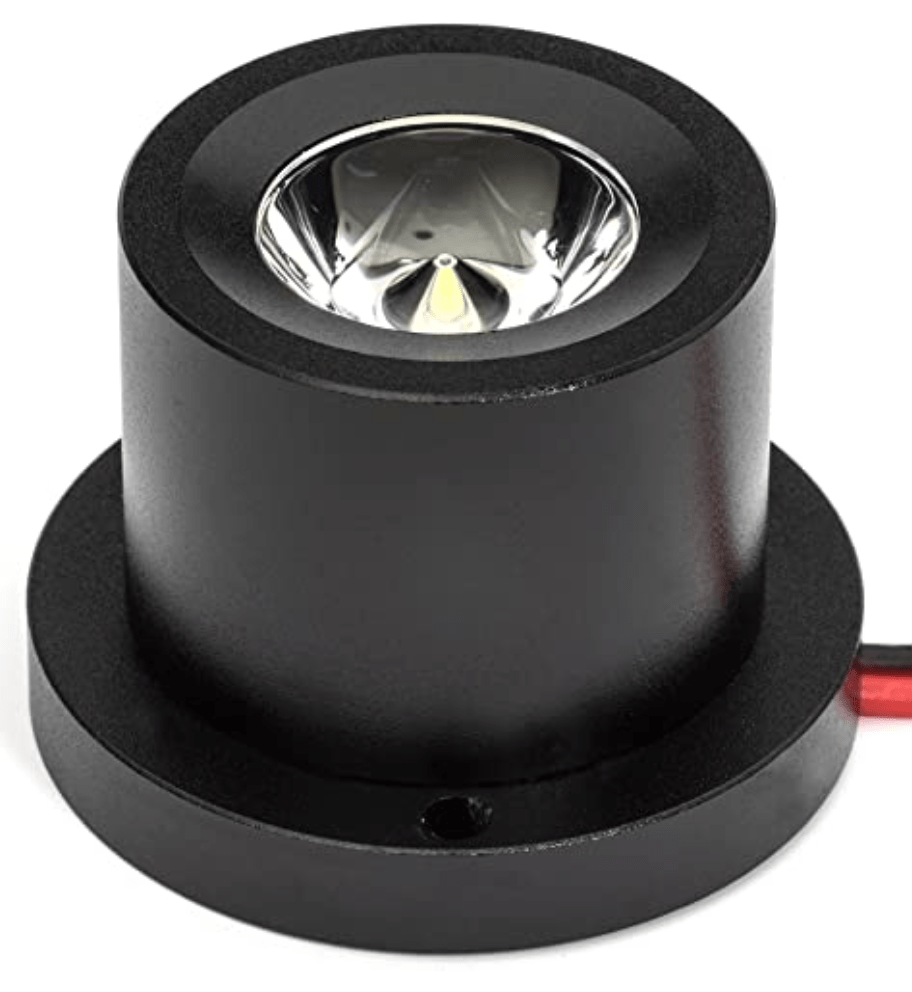 I’ll use a FLiCr board configured with seven MOSFET-driven PWM outputs, running at 24v. We haven’t finalized the type of spot light, but it’s likely to be this 3W unit, which has a diameter of 40mm (1.6″).