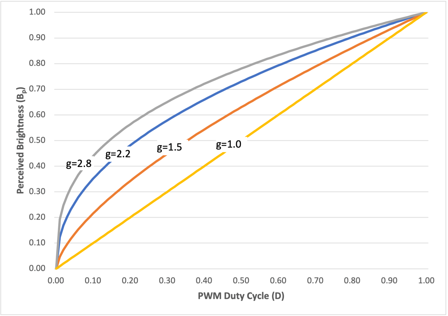 Another way of describing this difference in brightness sensitivity is to say that our eyes have a non-linear response to luminous intensity: a steady (linear) increase in luminous intensity is not perceived as a linear increase in what we think of as “brightness”. The degree of this nonlinearity is specified by a parameter called gamma, which varies depending on the specific type of light source. For LEDs, the typical values of gamma range between 1.5 and 3. The graph below illustrates relationship between PWM duty cycle (D) and perceived brightness (Bp) for some example values of gamma (g). The yellow curve (g=1.0) shows the ideal situation where the PWM duty cycle linearly translates to perceived brightness.