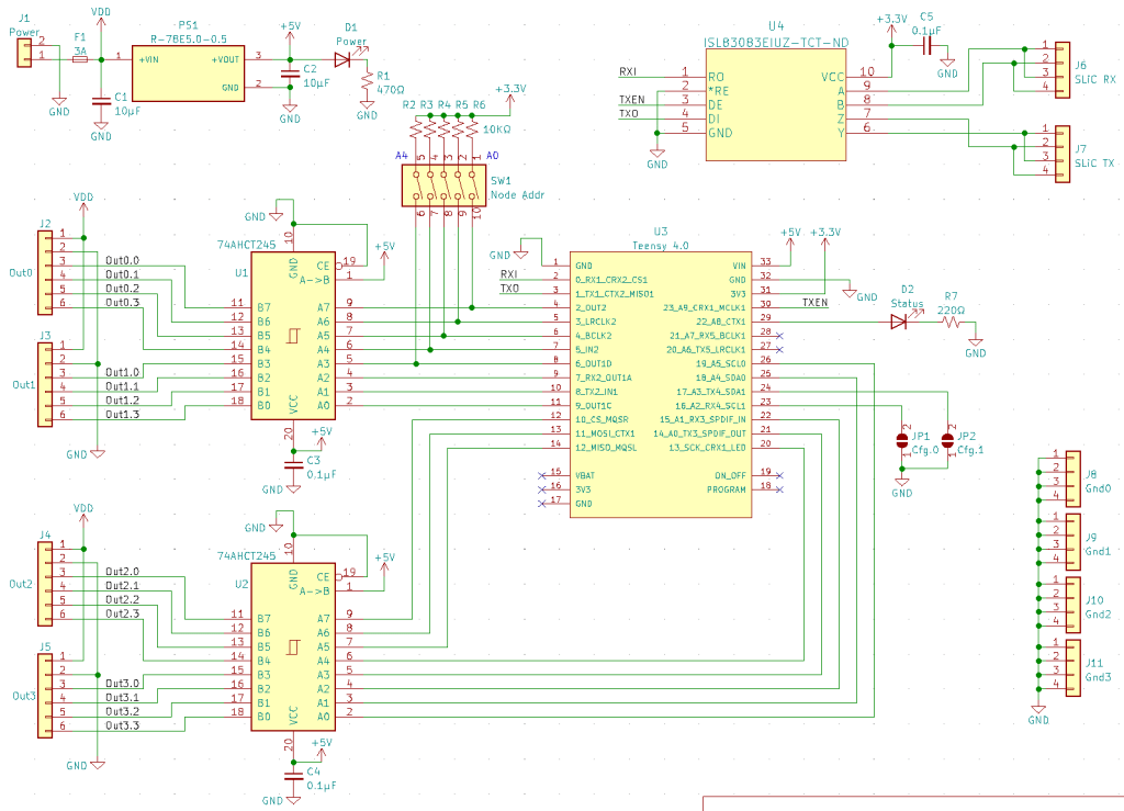 Internally, the Flex controller is very similar to my previous boards. As always, it’s based on a PJRC Teensy 4.0 microcontroller unit (MCU). Until now, my controllers have only needed 8 digital outputs to drive addressable or non-addressable (“analog”) LED strips, the latter with MOSFETs to provide the necessary drive current. Since the Flex board needs 16 outputs, I had to do some shuffling to free up some pins. In doing so, I was left without enough input pins to read the 5-bit DIP switch that indicates the board’s SlicBus node address in a multi-controller system. As shown in the full schematic below, I ended up sharing 5 of the LED output pins.
