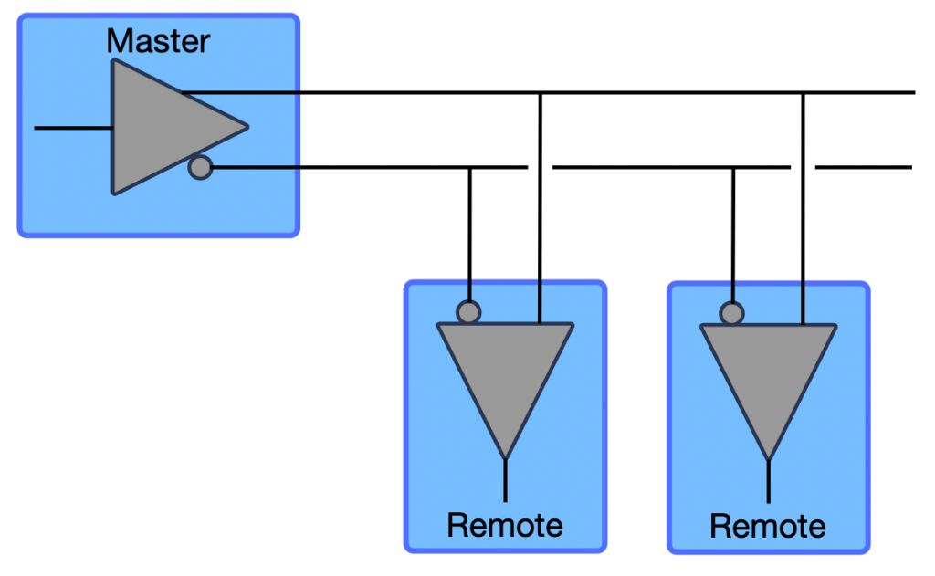 This communication approach has worked fine, but there are some occasions when it would be helpful for the master to receive some information back from the remotes. At minimum this could help with debugging, since the remote controllers are often in difficult-to-access locations in a large artwork. For the Flex controller I’ve switched to the ISL83083E RS-485 transceiver chip. This chip has a single receiver that allows me to use exactly the same master-to-remote communication paths as shown in the diagram above. It also contains an independent transmitter that I’ve used to implement a separate remote-to-master communication path, shown at right. Since this is a multi-transmitter, single-receiver architecture, only one remote controller at a time can enable its transmitter. This is done with some minor extensions to the SlicBus command protocol, where the master controller specifically requests data from a single remote node. This tells the remote controller to enable its transmitter, and to send the data within a time period indicated in the command from the master. Stay tuned for a future article on the details of the SlicBus and its communication protocol.