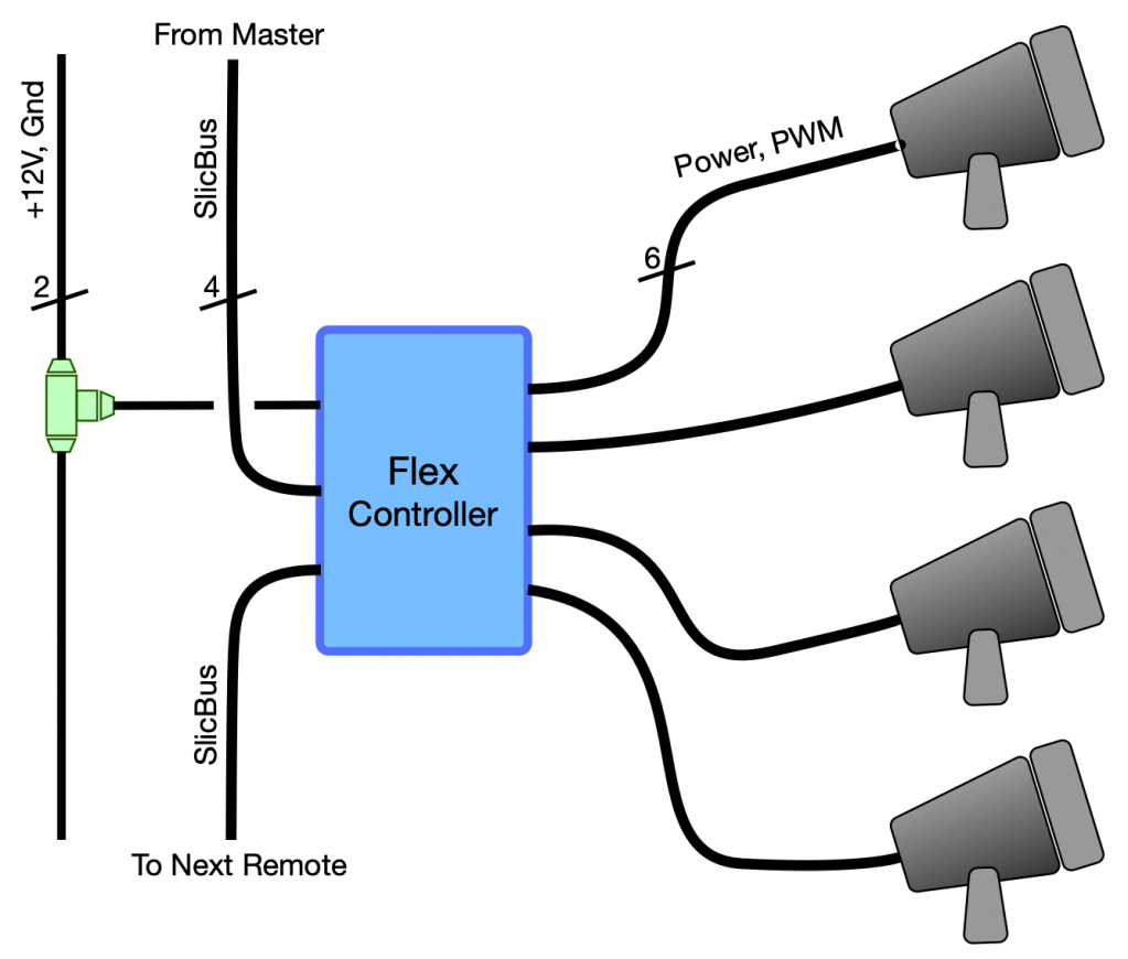 The diagram at right shows the Flex controller connections in the “max Fido” configuration. Note that the 2-conductor power cable (likely to be 18 AWG in most applications), is tapped to provide a stub connection to each of the Flex boards. I chose this approach to avoid routing the power lines though the Flex PC board. In previous projects, I’ve used this IP68 3-way junction device. It’s a bit expensive, but has worked week for me.