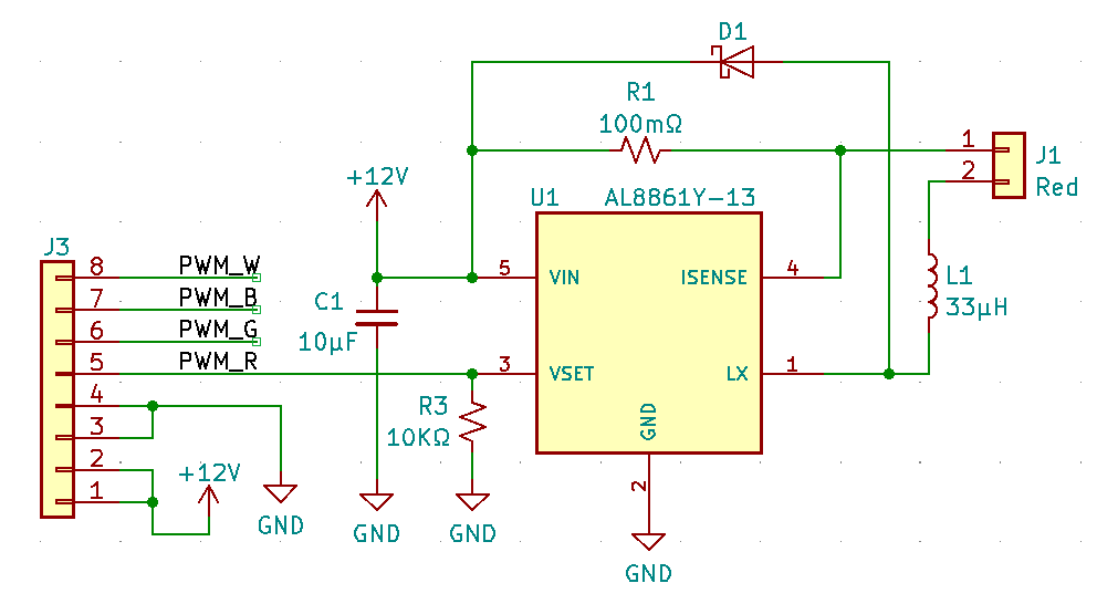 The roughly triangle-shaped “ripple” in the waveform is an expected characteristic of any buck converter circuit. The AL8861 data sheet indicates that the ripple should be 26% peak-to-peak. This looks closer to 35%, but I’m not going to worry about it.