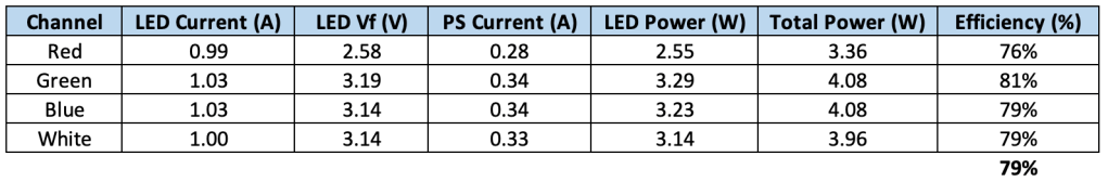 I analyzed the driver efficiency on a per-channel basis when operating at 100% duty cycle. I measured three parameters: the LED current (should be 1.0A RMS), the total current delivered by my bench power supply (set at 12.0v), and the forward voltage drop (Vf) of the LED. Here are the results: