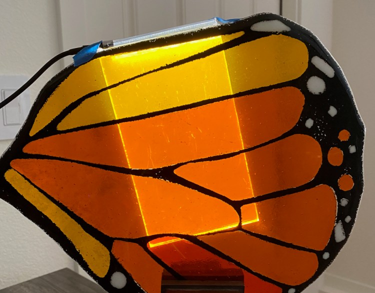 I’m completely stalled on my effort to create an ultra-thin backlight for Peter Hazel’s Dancing Monarch glass butterflies. I haven’t been able to find a source (other than a small sample) for the only acrylic sheet material that works well in this application: ACRYLITE® LED LIGHT GUIDING EDGE LIT SHEET. I’ve tried other types of acrylic advertised as “light guiding”, but none of them come close to the results I achieved with the Acylite sample. Actually, I could buy this material but I’d have to commit to buy at least one full sheet (32 sq. ft, 3 sq. m) at $800 USD. I’ll keep looking.