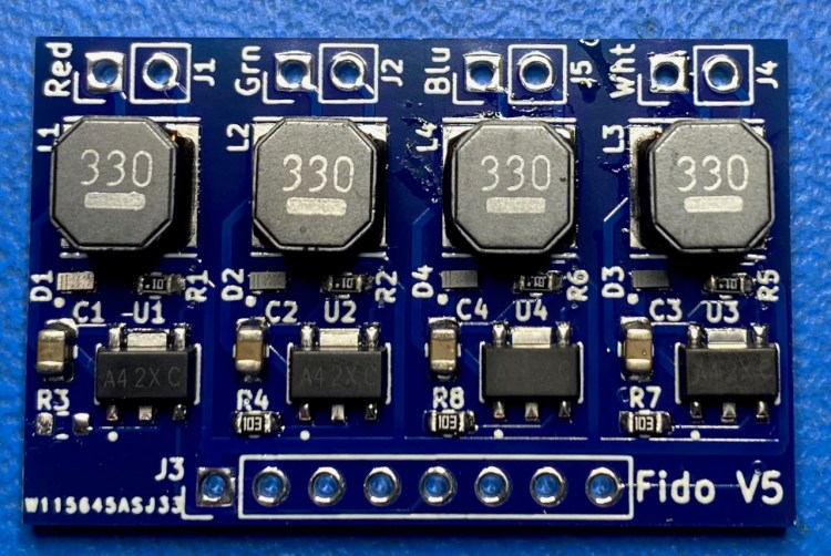 I’m continuing to use the new Flex controller for FidoLight testing, and that’s going pretty well. Unfortunately, my oh-so-clever method for sharing GPIO pins between the “node address” DIP switch and the PWM outputs has an issue that I didn’t forsee. Under certain conditions some of the PWM outputs get briefly driven high during the power-up sequence, relating in full-brightness flashes from the FidoLights. There’s an easy fix, but I’ll need to make a minor PC board change. I’ll wait until I complete more testing before I pull the trigger on this change.
