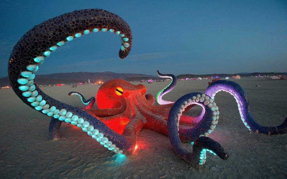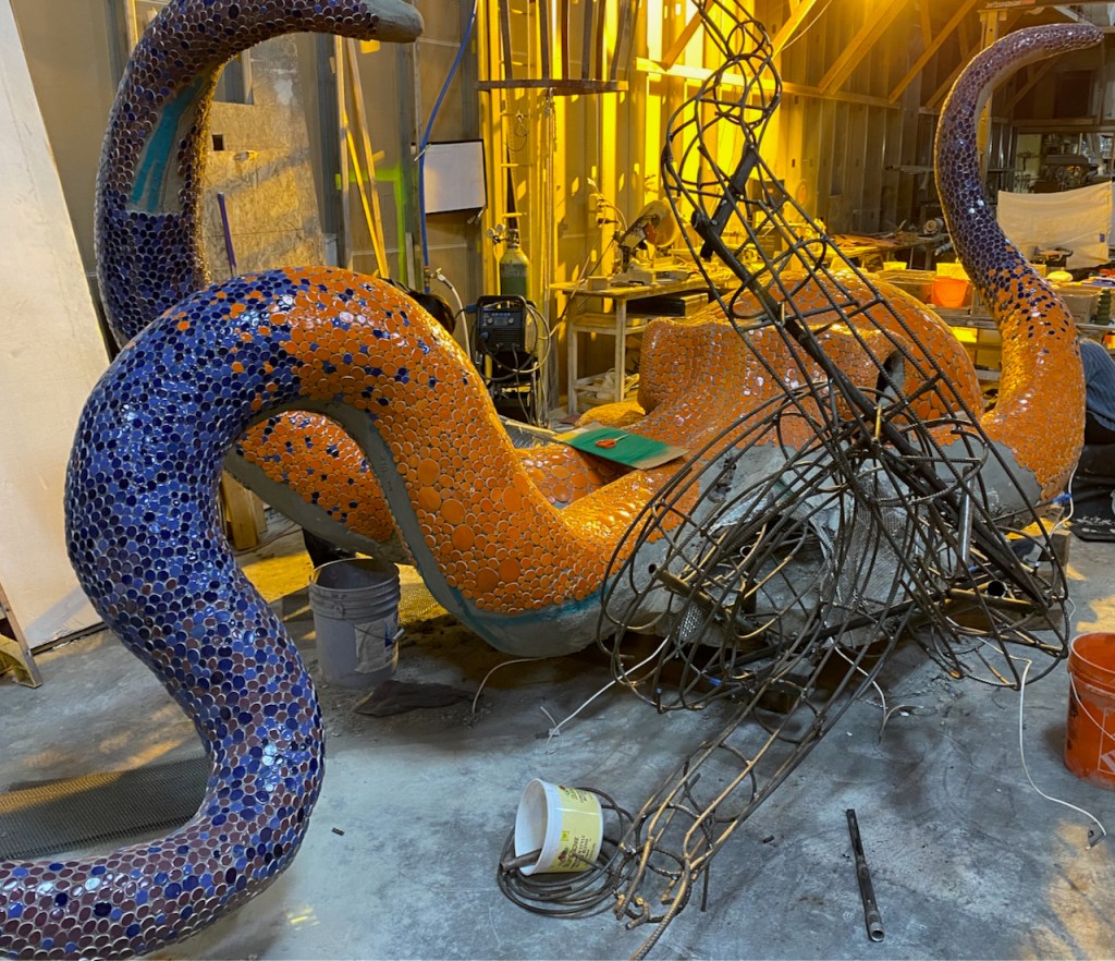 OK, here’s the first of the “new” projects. Well, not exactly new. Peter has been commissioned by a commercial builder to produce a slightly smaller version of Octavius, the 30-foot (9 m) long ceramic tile octopus that he originally created for Burning Man 2016.