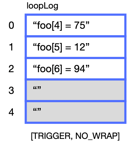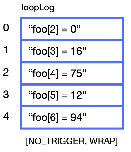 Back to the example…When the loopLog is examined (we’ll get to how later), it might look as shown at right. Even though the loop iterates 7 times, only the first 5 entries are captured, based on the maximum size that was previously defined. If it were important to capture the values for all loop iterations, the cLog could have been sized larger. But if it were more important to capture only the values of foo in the last 5 loop iterations, the WRAP option could have been selected instead of NO_WRAP.
