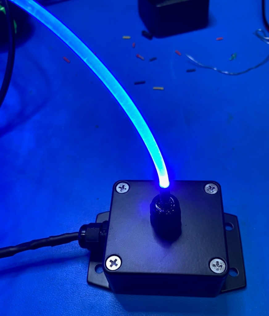 And the Desert Shark is still circling…Peter hasn’t yet found a buyer, but he plans to display it, along with Octavius, at the Napa Lighted Art Festival that starts in late January. He’s made some major modifications, including the removal of all the white exoskeleton lighting. The glass scales are now mounted directly to the metal exoskeleton, resulting in a more streamlined appearance during daytime. We’ve previously struggled with an approach to illuminate the stainless steel fins, and this time we’re trying something completely new. We’re attaching side-emitting fiber optic material to the perimeter of each of the three fins and tail. The 4mm diameter fiber will be lit by eight “illuminator” units that I built using a 3W blue LED. The fiber brightness is pretty reasonable up to about 8 feet (2.4m), and we’re using two illuminators for each fin.