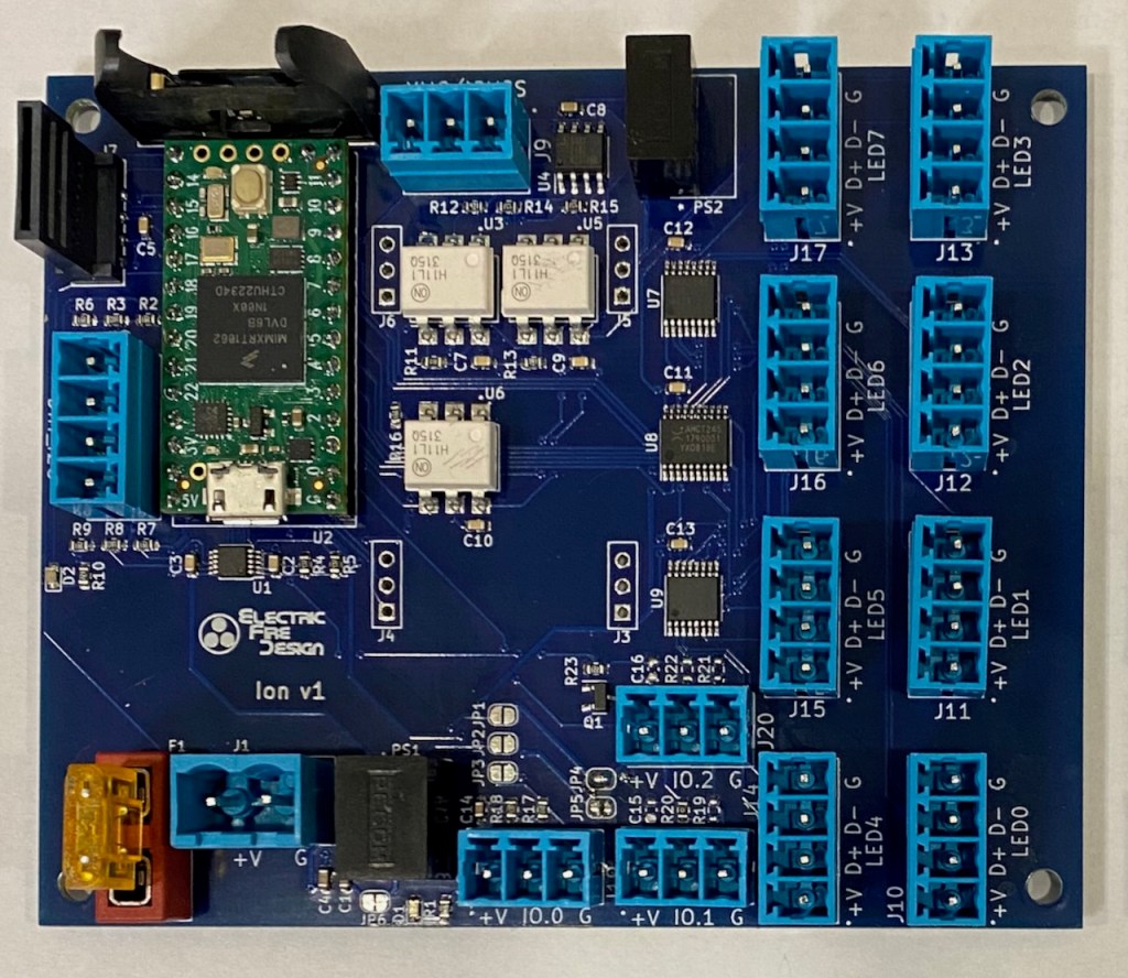 Ion v1 – This is a brand-new board that I’m still testing. It can be used as a master controller, communicating with the SLiC v2/v3 boards via an optically-isolated RS-485 interface. This interface can also be configured as a single-universe DMX output port to communicate with DMX light fixtures. Or it can be configured as a DMX input, enabling it to accept commands and data from an off-the-shelf DMX show controller.