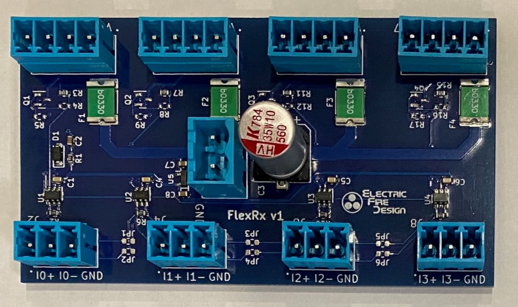 FlexRx Receiver – This board receives four differential (twisted pair) interfaces from the Ion controller and converts them into a single-ended LED data signal for each of the four LED strip outputs. Power for the LED strips can be supplied from the Ion controller or from a dedicated local power supply. Each LED output is fused with a resettable 3.3A PTC fuse.