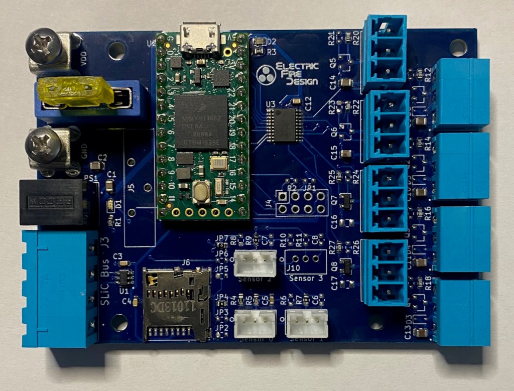 FLiCr – This has been my workhorse board for a couple of years. As a standalone controller, it has 8 outputs that can drive addressable LEDs or individual PWM-controlled devices/LEDs. It can also be used as a master controller in a distributed system, using an RS-485 serial bus (SlicBus) for communication with the SLiC v2 or SLiC v3 boards shown below. It has 3 switch/sensor inputs and a microSD card slot for storing FireScript sequences and color palettes.
