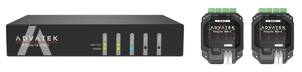 For Jibaro Soy, which uses lots of addressable LED strips in addition to DMX wash fixtures, I chose the Advatek Pixlite T8-S Mk3 controller and its associated Pixlite R4D-S long-range receiver units.